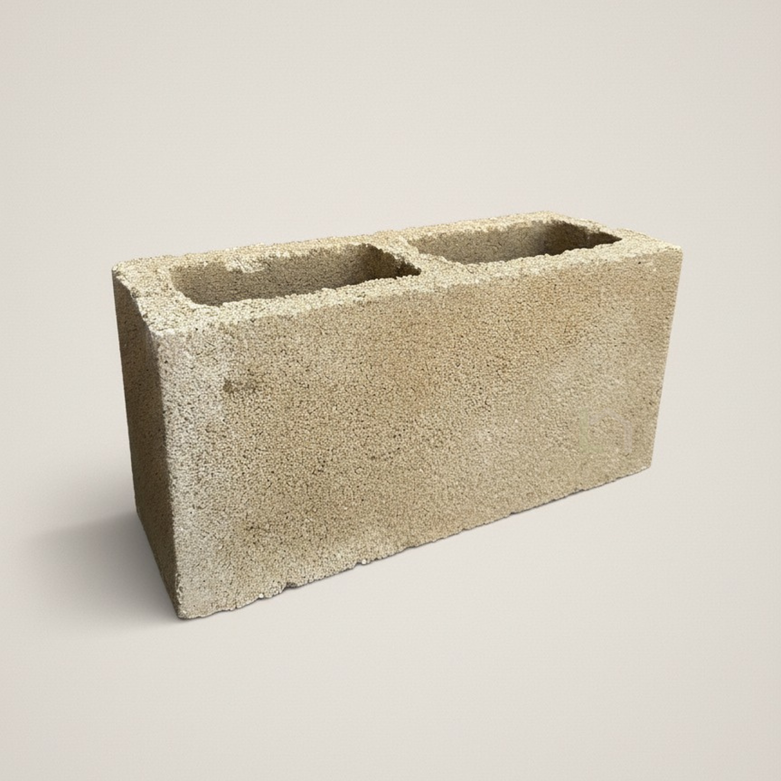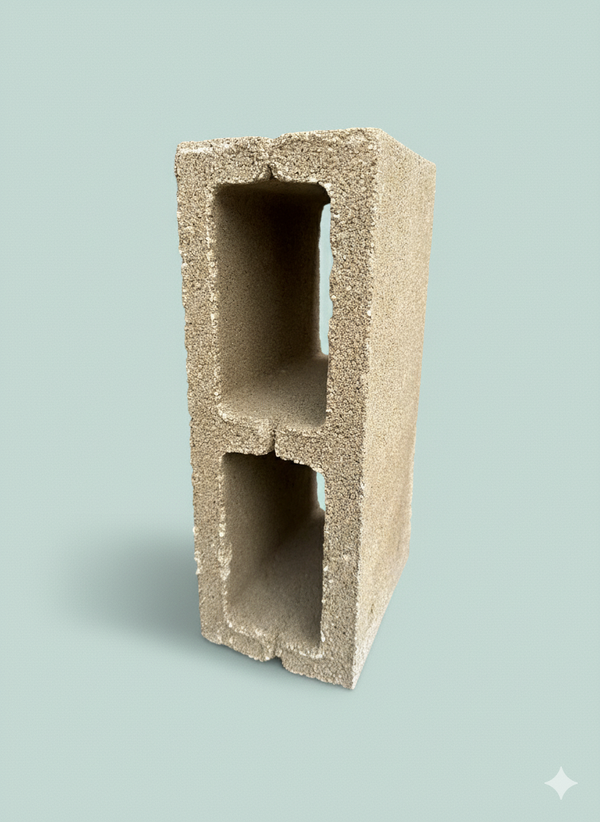 Bloque de cemento gris, es una pieza de 2 celdas huecas y de caras lisas.