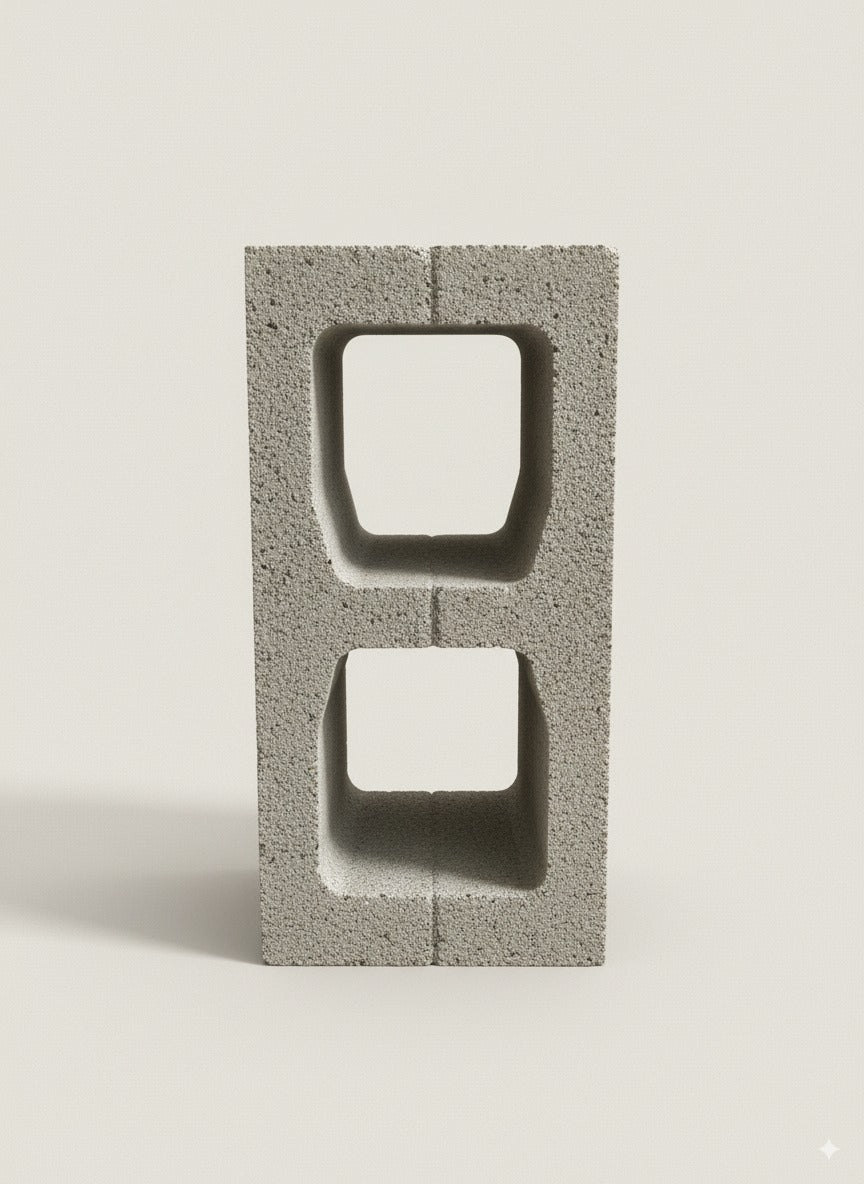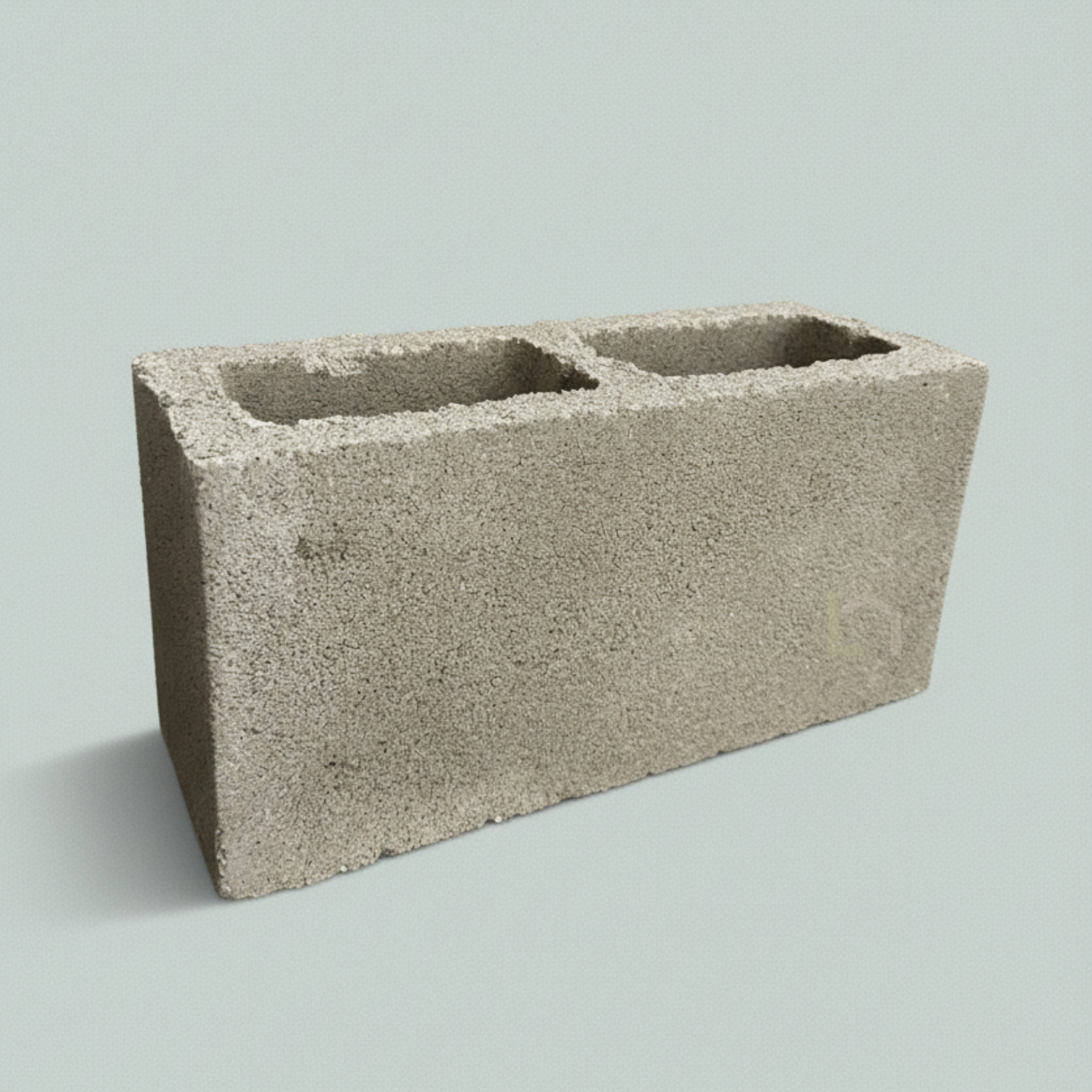 Bloque de cemento gris, es una pieza de 2 celdas huecas y de caras lisas.