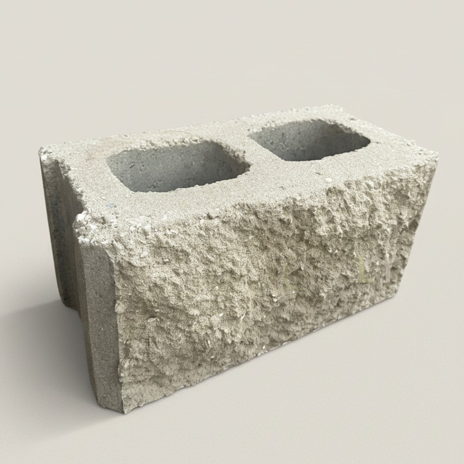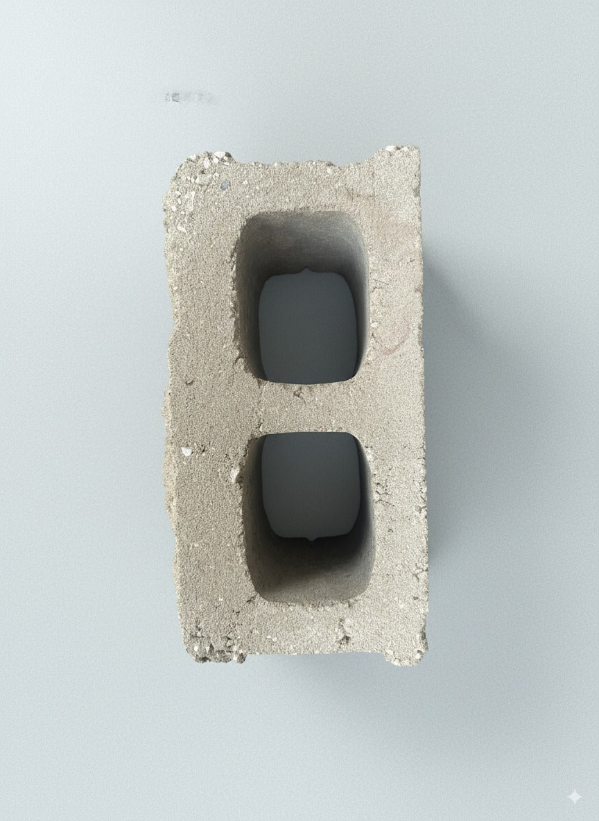 Bloque de concreto gris, es una pieza de 2 celdas, con una cara lisa y una rustica